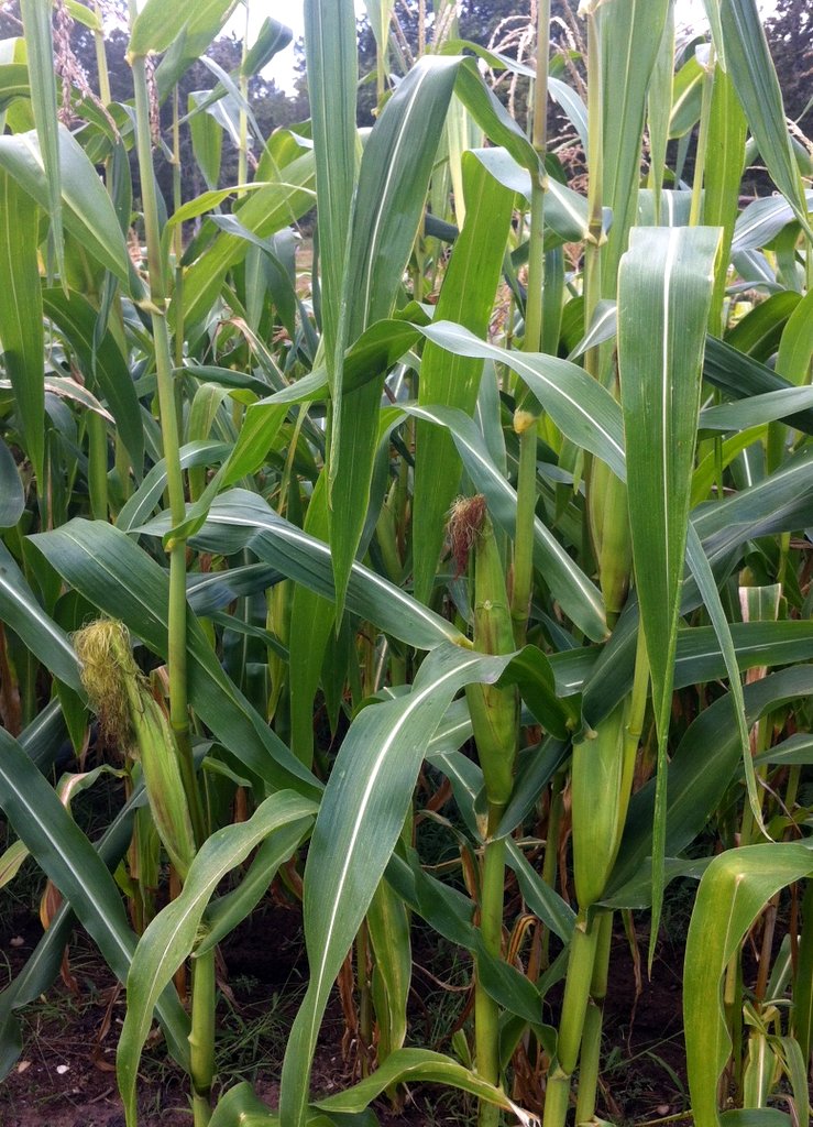 Le Maïs vert d'Oaxaca (à gauche) est vigoureux. Plus de 2 m avant floraison.